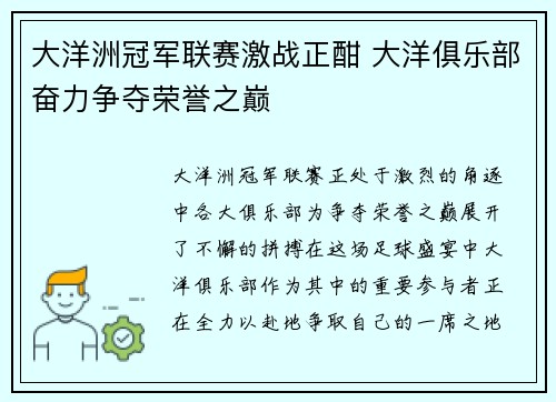 大洋洲冠军联赛正处于激烈的角逐中,各大俱乐部为争夺荣誉之巅展开了不懈的拼搏。在这场足球盛宴中,大洋俱乐部作为其中的重要参与者,正在全力以赴地争取自己的一席之地。本文将从四个方面详细探讨大洋洲冠军联赛的激战情形,并深入分析大洋俱乐部在其中的表现和努力。通过对比赛进程、俱乐部阵容、战术布局以及对手的强大压力等方面的分析,本文将为读者呈现出一幅关于大洋洲冠军联赛激烈竞争和大洋俱乐部奋力争夺荣誉的全景画卷。